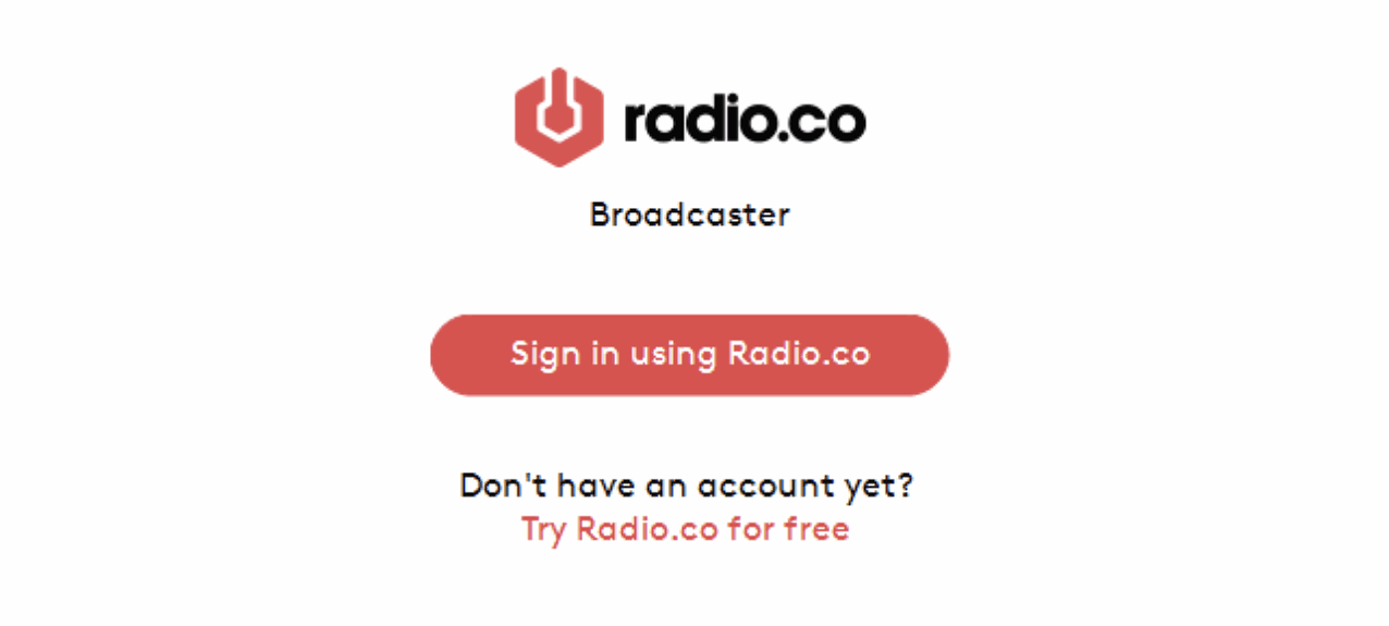Once you've installed the broadcaster, you'll need to start the application by double clicking on it. You'll then see the below screen, where you need to click on the 'Sign in using Radio.co' button.