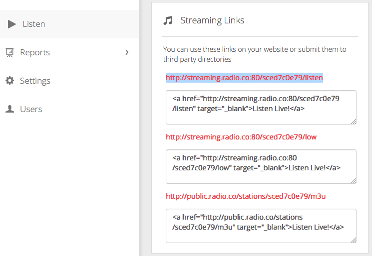 Most streaming links are accepted like the ones from Radio.co stations, however if you’re hosted with a third-party provider then follow these guidelines.