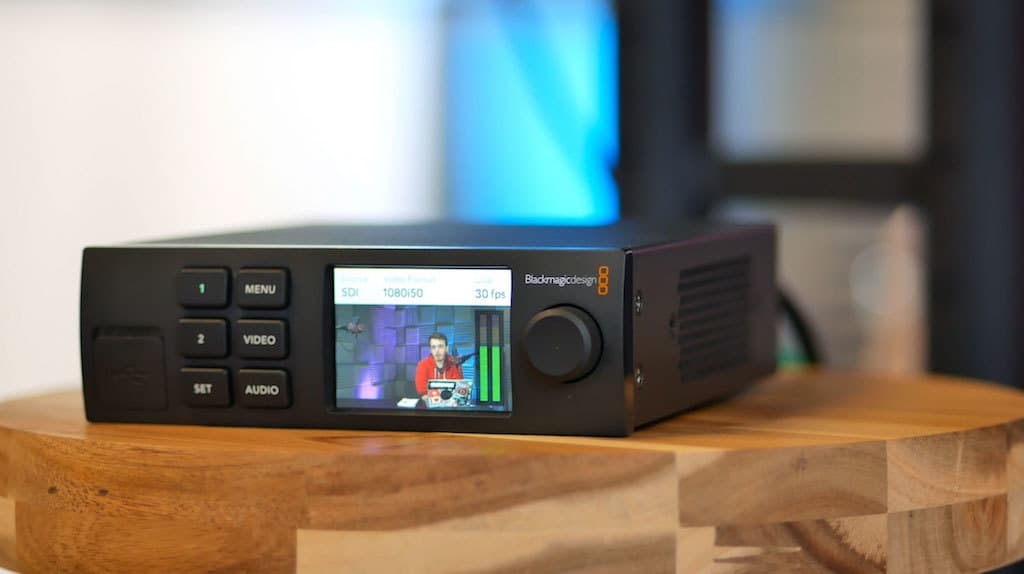 This handles the video input for both cameras and the input from the mixer. The Blackmagic box allows us to manage two cameras at once. This setup works well for us because we're going to be using two cameras and syncing up the audio from the mixer to the cameras.