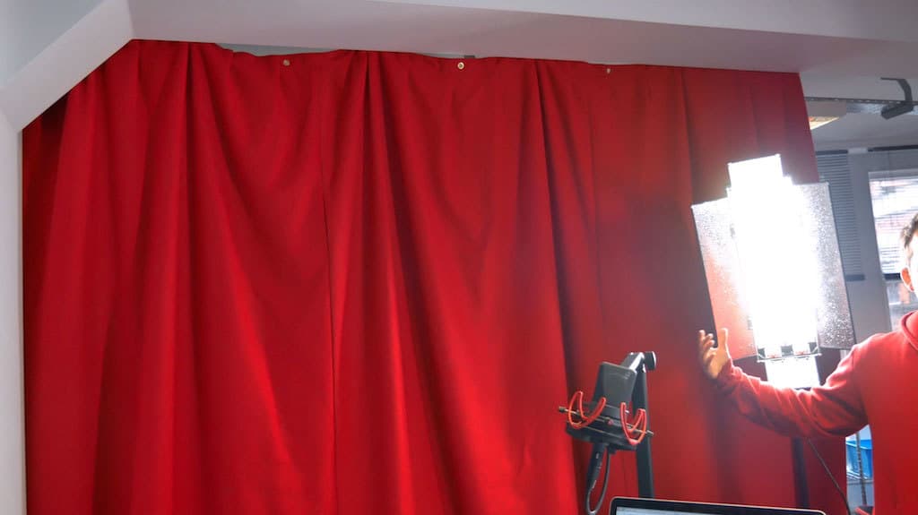 Behind the presenters we use foam padding on the wall. This provides additional soundproofing. To make the backdrop look nicer we use accent lighting on the floor pointing at the wall.