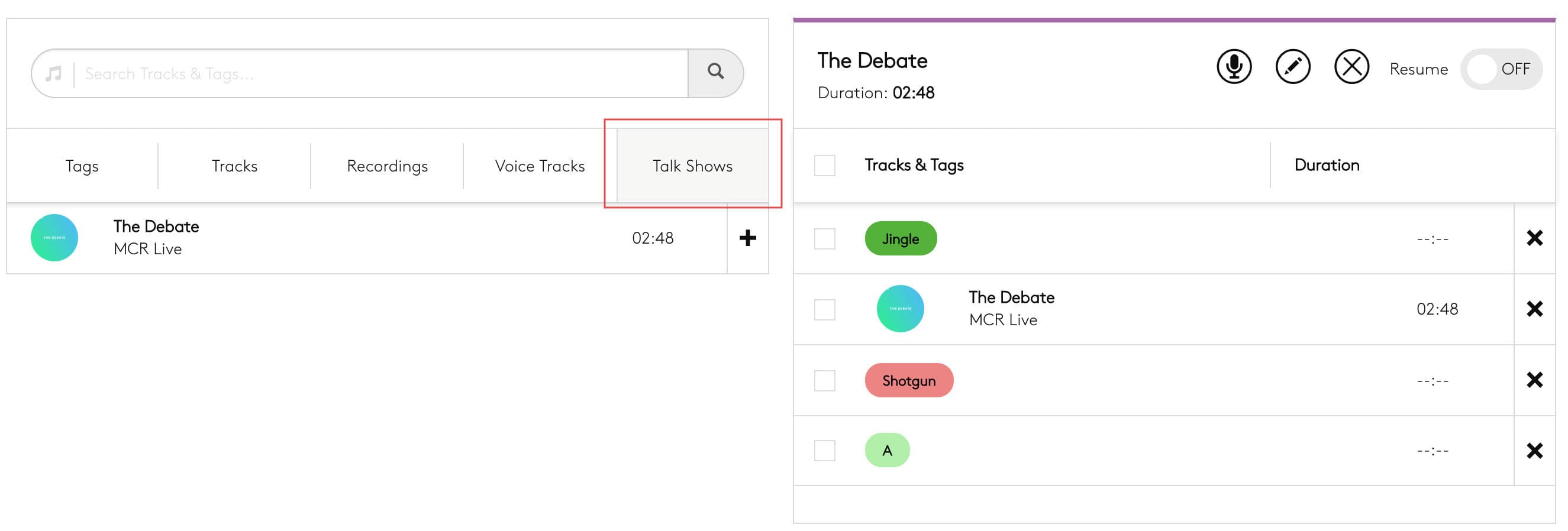 Recorded talk shows are added to your Media Library. Insert them into playlists just like any other track for them to play out on your radio station.