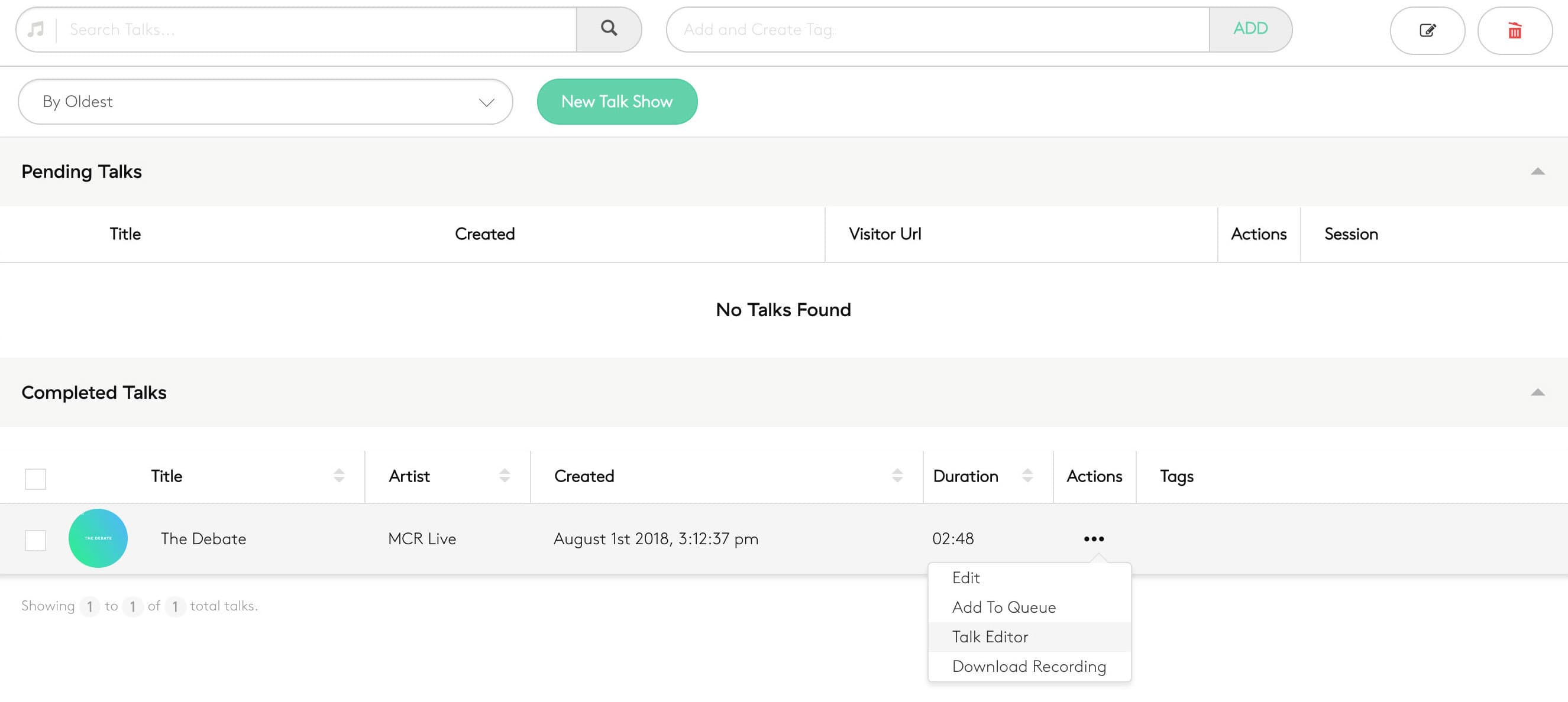 Click the green Create button to add your show to your station. This will appear under Pending Talks as shown below: