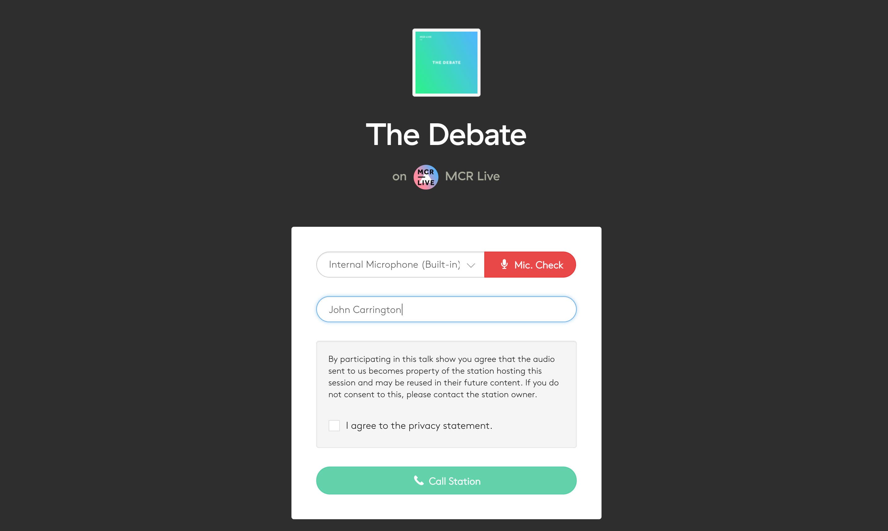 When the talk show is ready, your guest will be asked to enter their name, choose their microphone/input, and agree to the privacy policy.