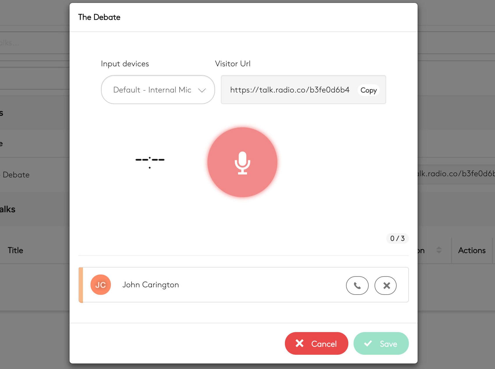 Once the session has been started, a recording window will appear. Within here you can choose your recording device, for example, an external USB microphone or audio interface. You can also see the status of any callers: