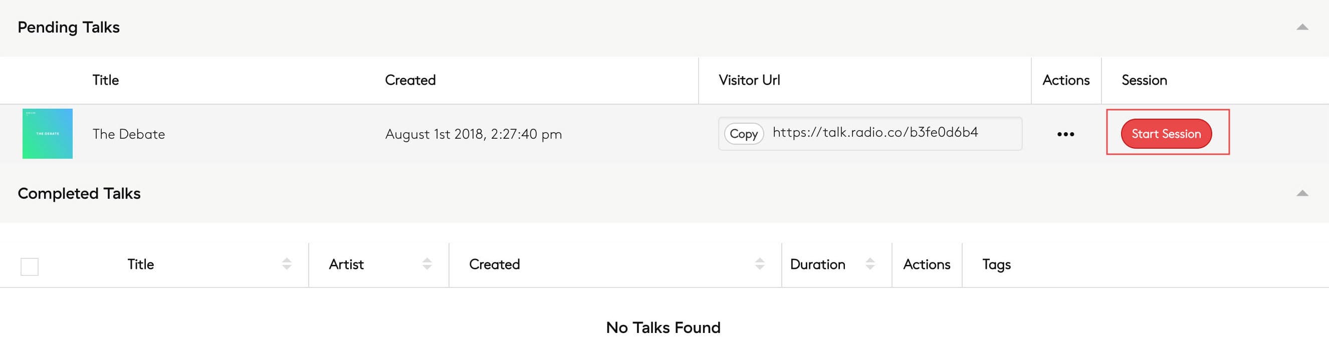 Once you've shared your link with your guests, begin your radio recording by clicking the Start Session button: