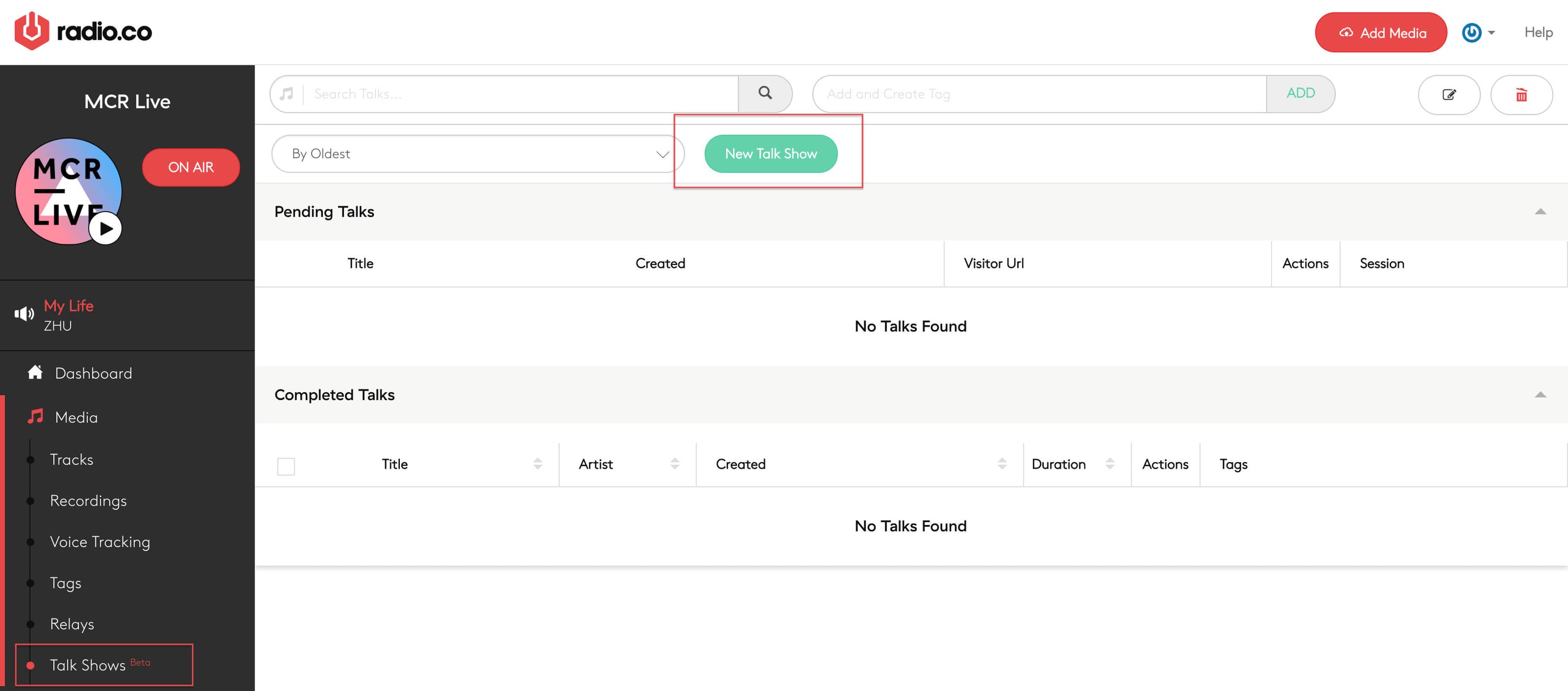 To setup a room for you and your guests, head to your Radio.co Dashboard > Media > Talk Show area. Then select the 'New Talk Show' button.