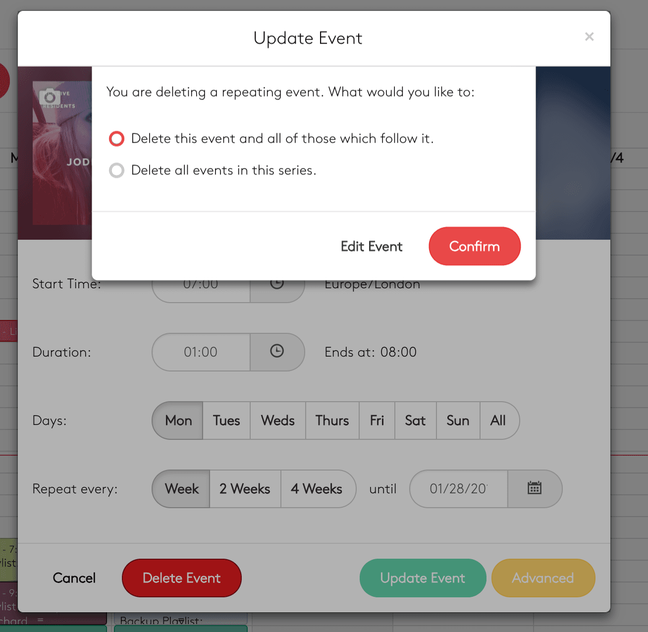 If you wish to schedule a Live DJ or Relay, or change event behaviours, click the yellow Advanced button towards the lower right of the popup. The Advanced drawer will open.