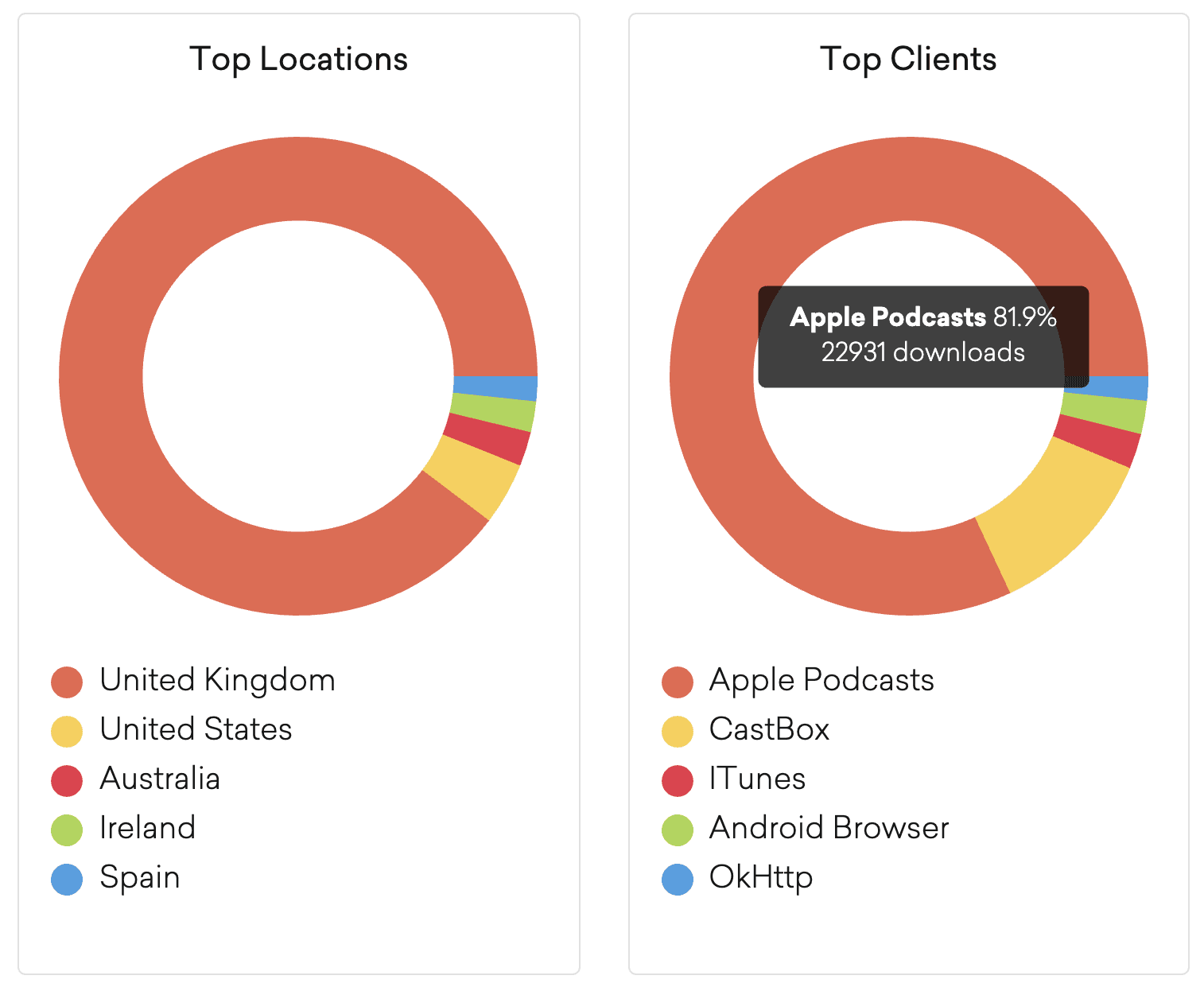 Discover your most popular episodes, where most people are tuning in from with top locations, and from which clients like Chrome, Apple Podcasts, and many more!