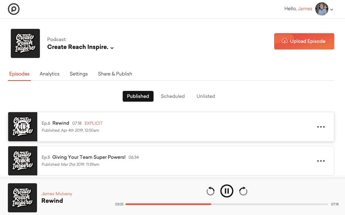 Either publish your episode right away, schedule it for later, or make it unlisted so no one can listen to it without a direct link. Playback all your uploaded episodes to make sure everything sounds right.