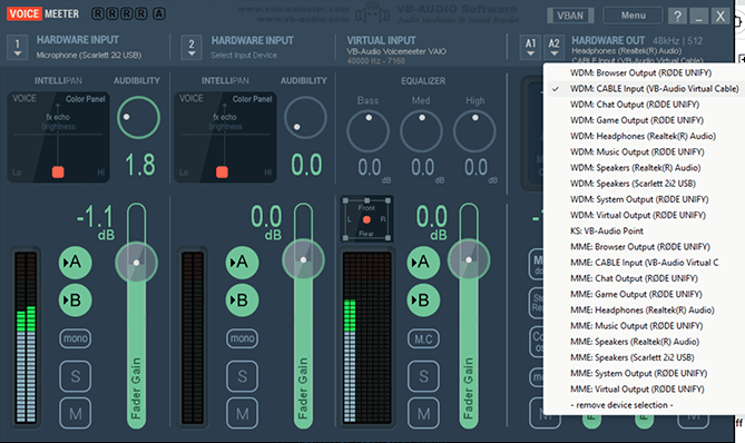The other output needs to be set as a virtual cable, in order to connect Voicemeeter with your radio station. So from the A2 dropdown, select your virtual cable input i.e. 'CABLE INPUT (VB-Audio Virtual Cable)'