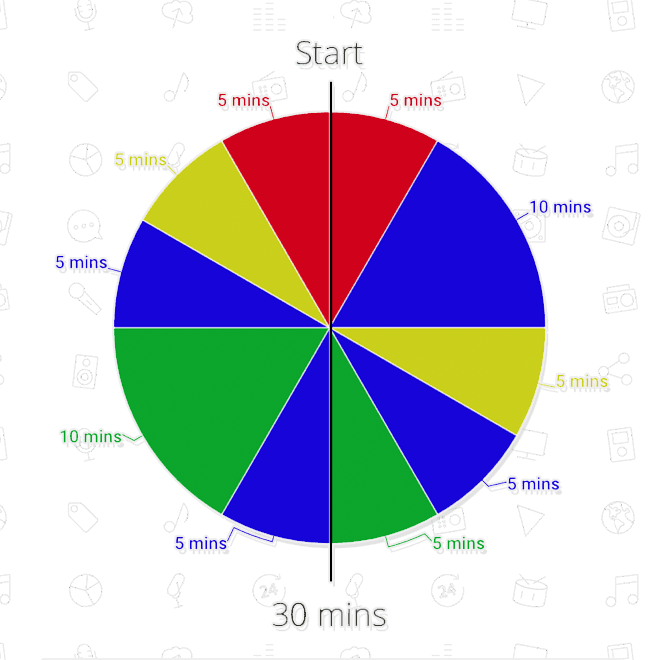 A radio show clock is essentially a pie chat with all the elements of your show mapped out by the hour. For example, this can be a mix of music, presenter talk, guest interview, and jingles.