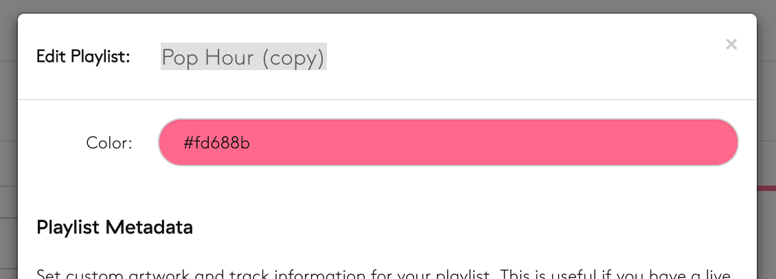 Selecting the pencil edit icon, you'll be able to customise your playlist's metadata. Title, artist, and artwork can all be swapped out, so within the dashboard, on players, and using the API, all these details will be shown.