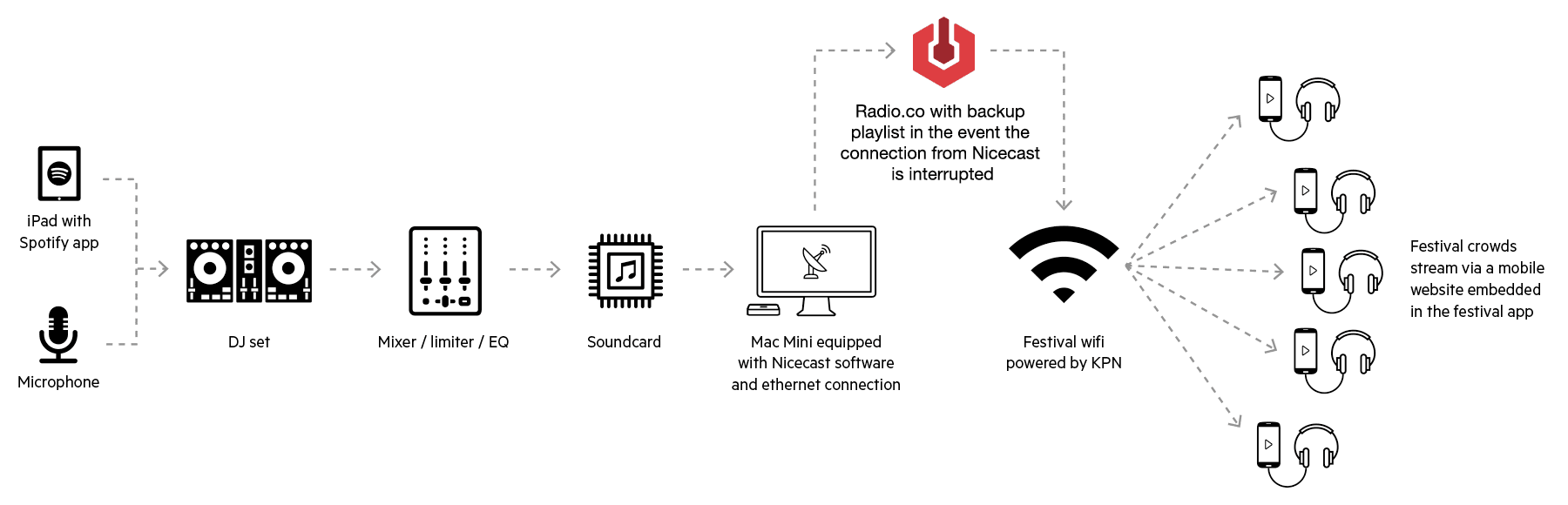 Listeners at the music festival had to be able to tune in on their phone, luckily the mobile disco's setup, along with Radio.co, were able to broadcast live music. Here's a look at how everything connected together: