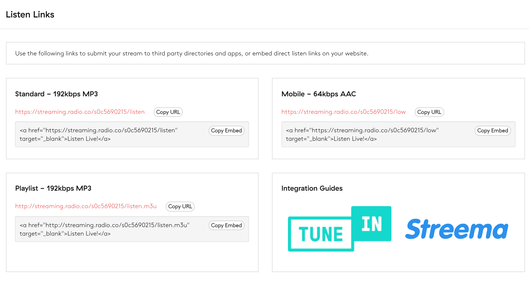 Streaming links are direct URLs to your station. Use them to either tune into your station or submit on third-party sites or directories. If mobile streams have been enabled in your 'Broadcast' settings area, you'll see two links.