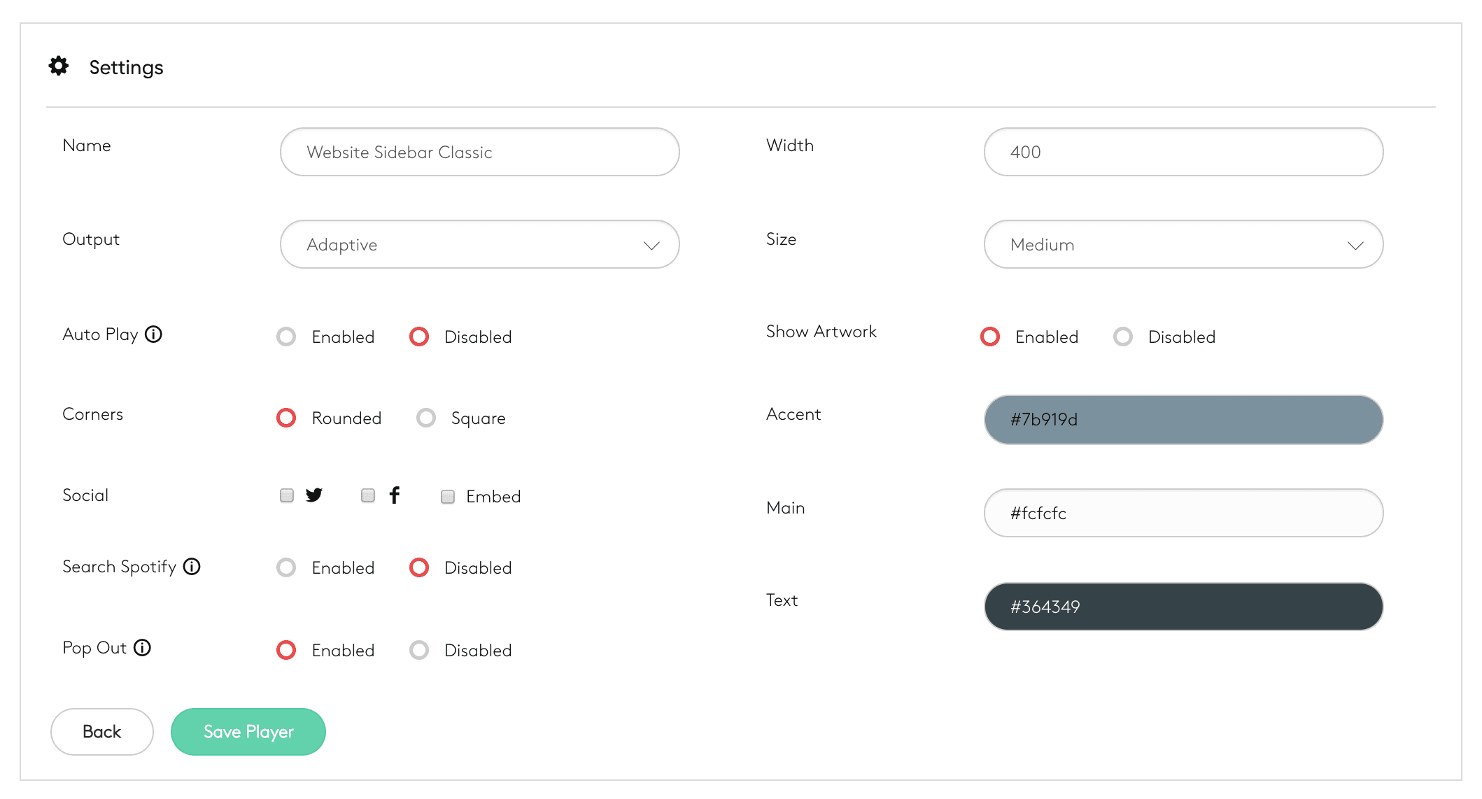 Classic: An improved version of our older player. Features include pop out, share now playing track, and open in Spotify buttons. The player also provides improved compatibility with responsive websites.