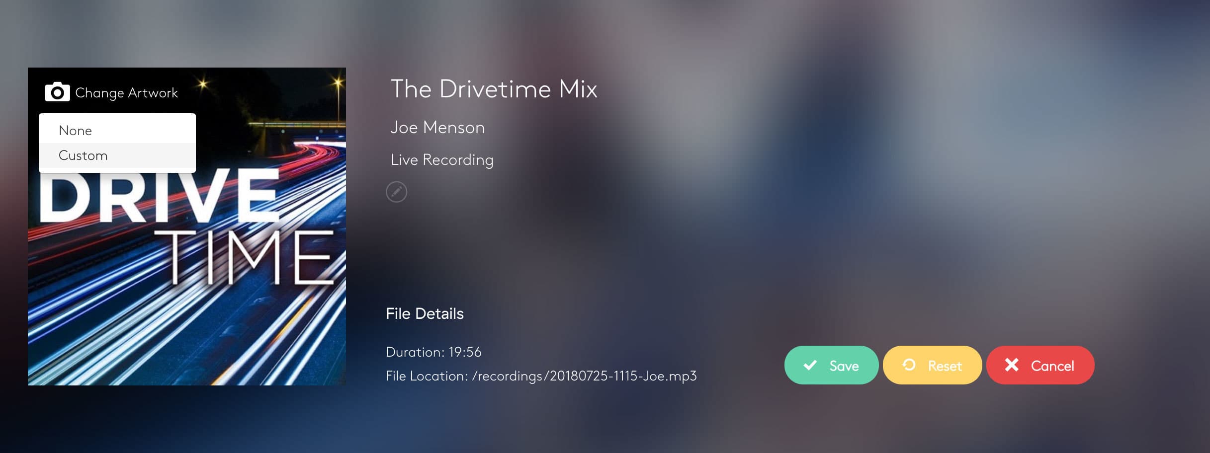 If you want to upload custom artwork, click the Actions (...) button next to the recording you wish to upload and then click Recording Editor. Change the title, artist, and artwork, then click Save when complete.