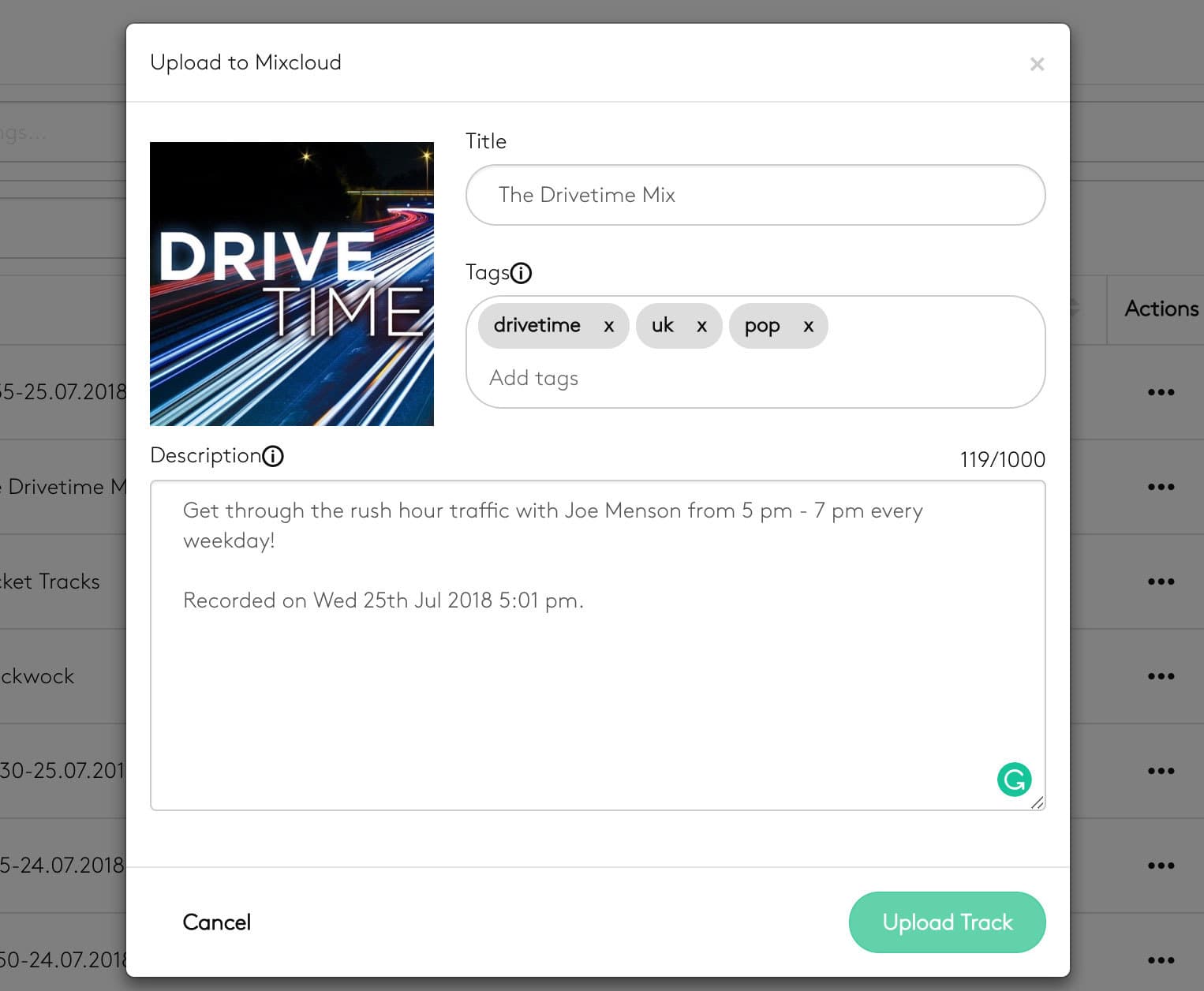 Edit the track title, add comma separated Mixcloud tags, and a description for your Mixcloud page. To publish, click Upload Track. This will begin the upload process.