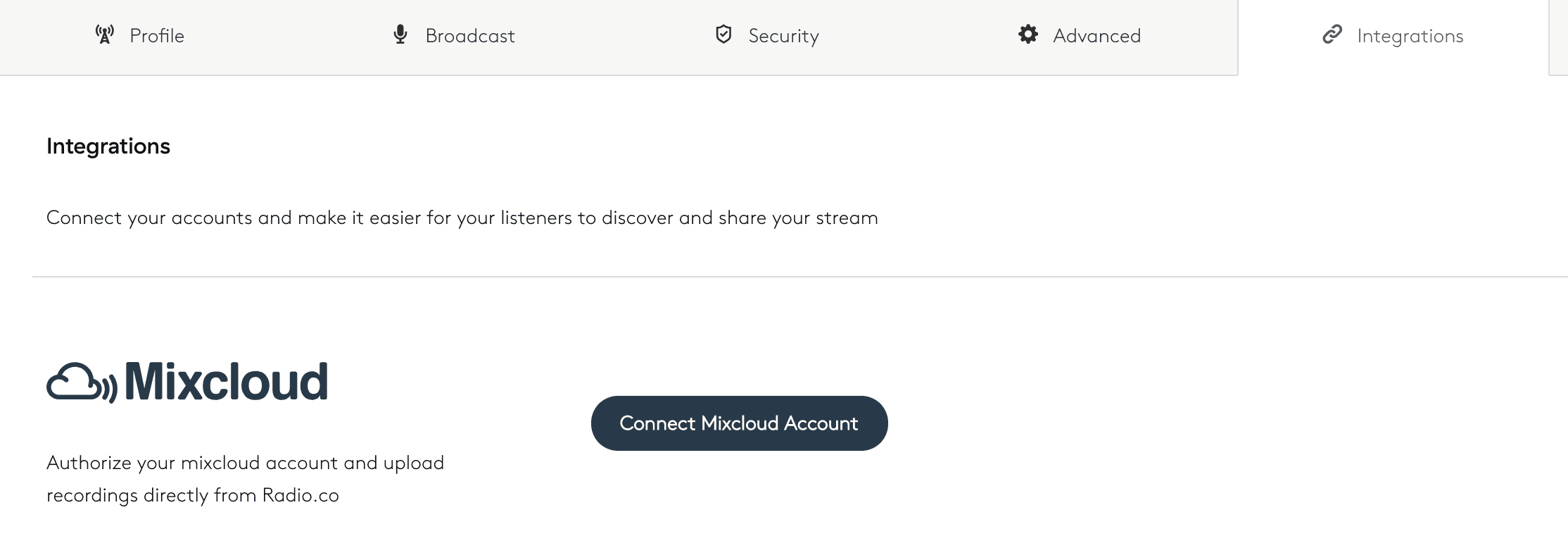 Once you have a Mixcloud account, go to Settings > Integrations in your Dashboard and connect everything up by selecting the Connect Mixcloud Account button and following the login instructions.