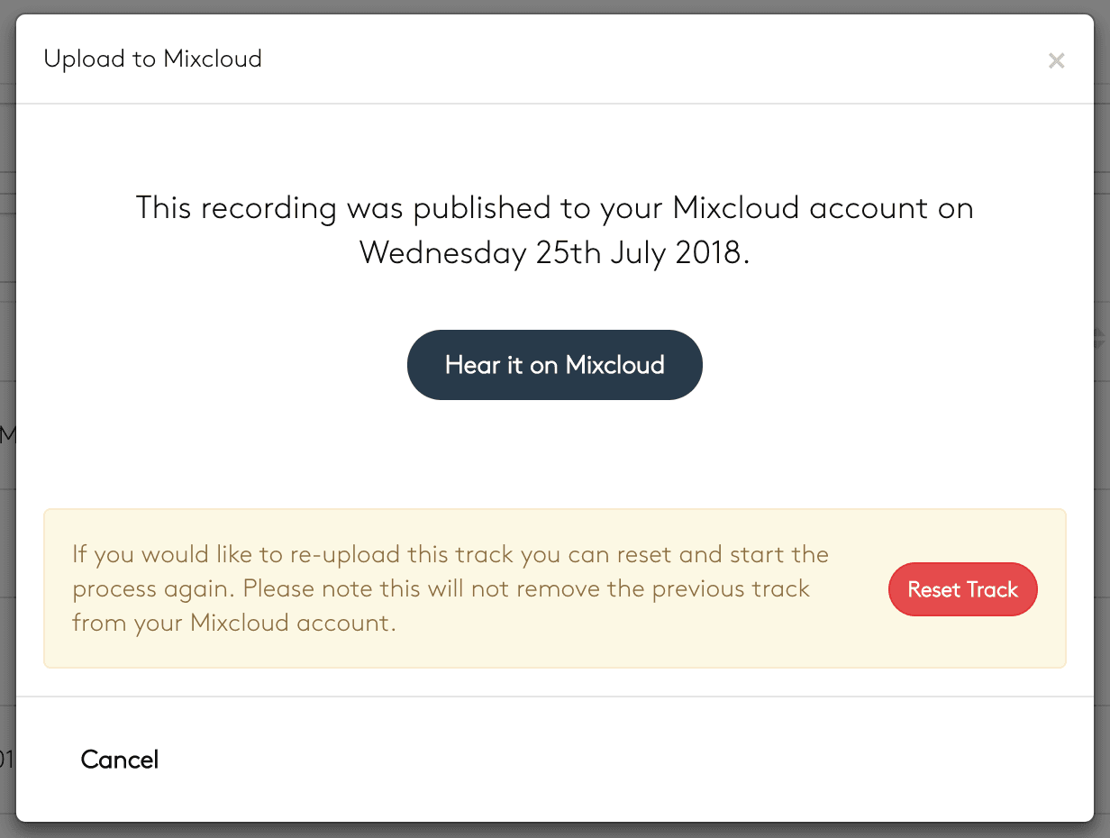 You can also reset the track in your media library. This is useful if you want to upload a track to a different Mixcloud account.