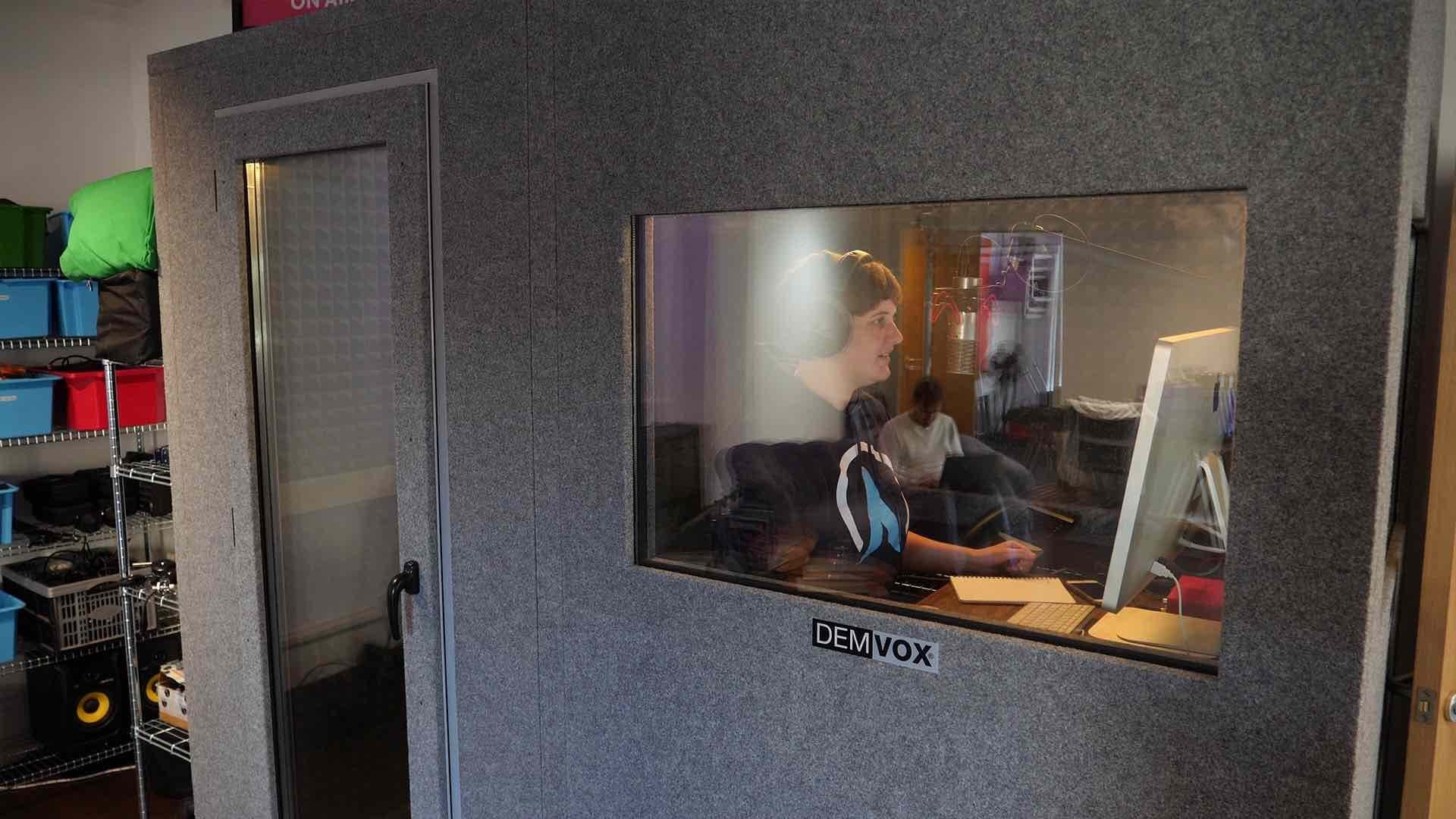 As you can see, our sound booth comes equipped with a wealth of features that make it the perfect space for broadcasting. The desk lets you set up shop easily, place down your computer, mic and mixer/interface and you’re good to go. They’re not just for broadcasting too, the acoustic treatment in sound booths makes them great for recording vocals, voiceovers and instruments too.