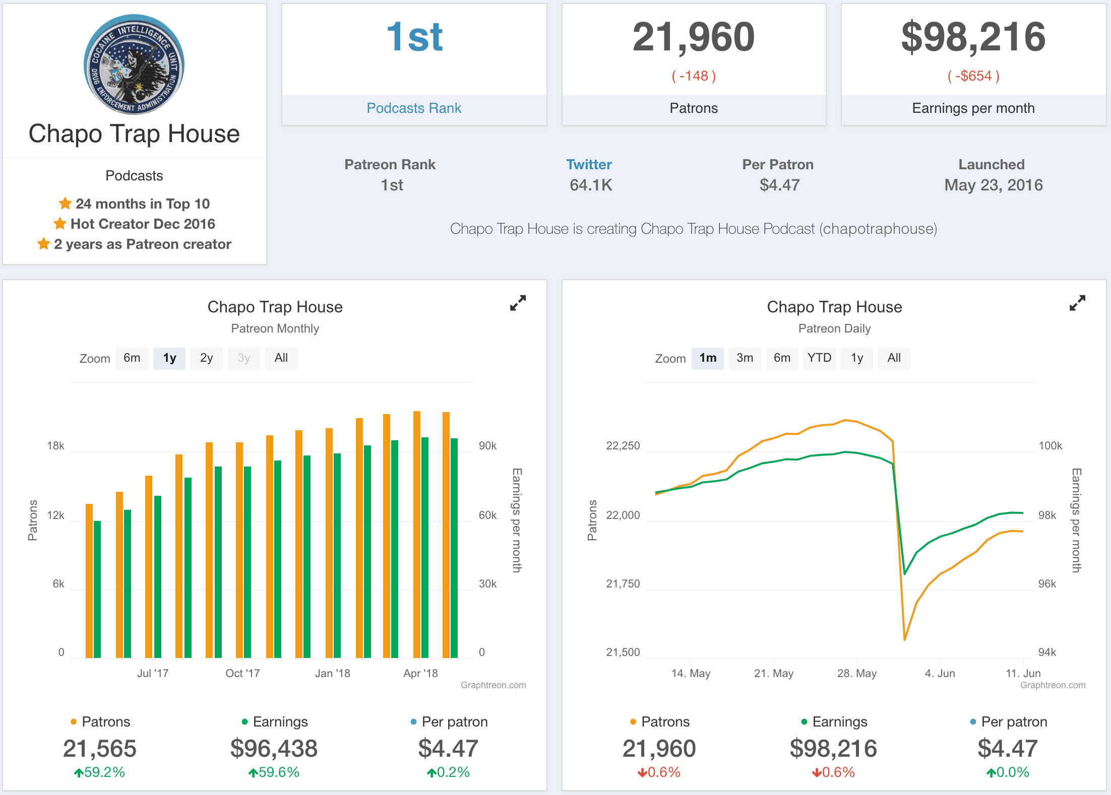 Chapo Trap House have published both their Patreon figures and their Earnings figures. As you can see, both are on the rise with total earnings for the year sat at just under $96,500! This shows you that you can absolutely create a successful podcast that you can run as a full time job.