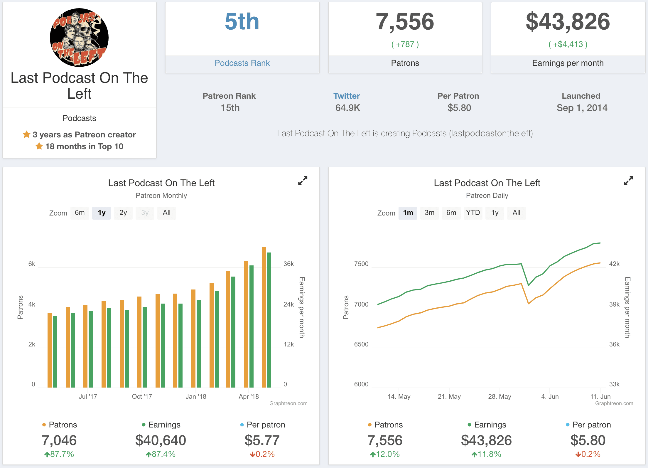 Ignoring the sharp decline towards the beginning of June due to a Graphtreon glitch, we can see that Last Podcast on the Left's earnings figures are steadily growing day by day. We can see that during the 1 year time period selected, their earnings are up by around 87.4% and on an increase.