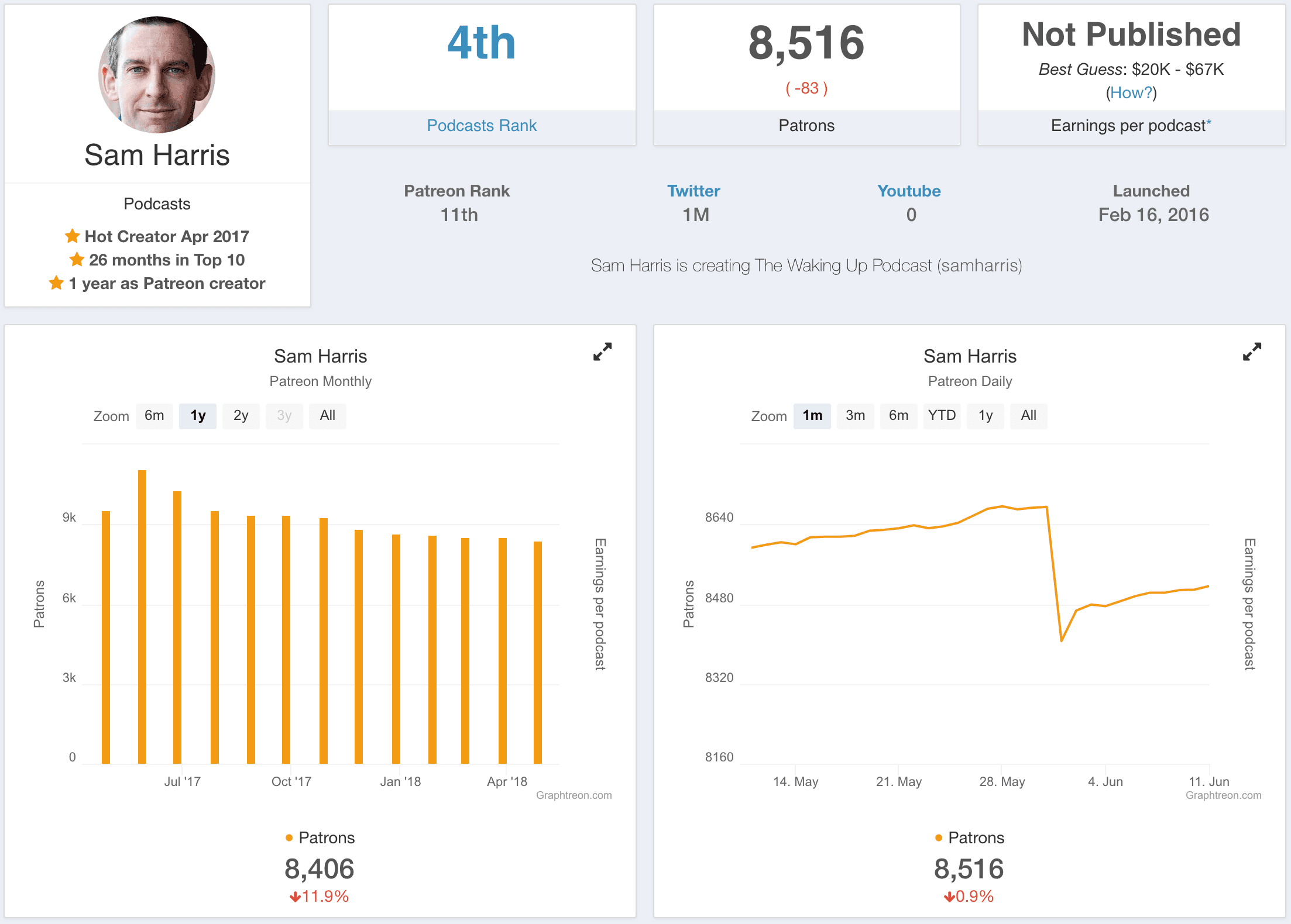 Again ignoring the sharp decline at the beginning of June, we can see that Sam's figures have been pretty steady the whole time, with around 8,500 regular Patreons. Although, he has chosen not to make his earnings figures visible, we can make a guess that his earning figures are steadily rising with the amount of Patreons.