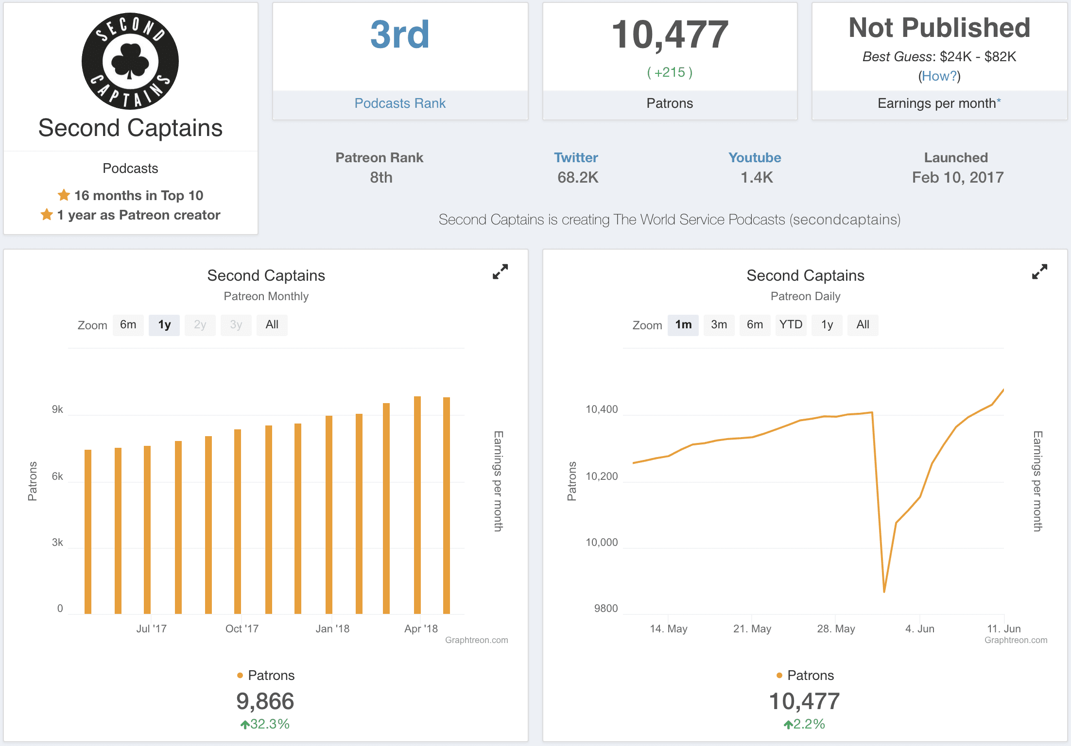 Second Captains, the creators of Second Captains World Service, have chosen not to display their earnings either, however they have displayed their Patreons. As you can see, they're also on a steady incline, meaning that their earnings for their podcast are definitely also on the increase.
