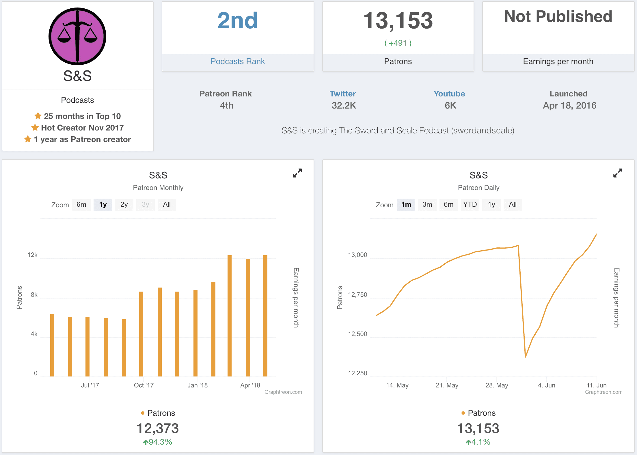 Sword and Scale are another podcast that has chosen to not make their earnings figures public. Looking at their Patreon figures though, you can see that, similar to the others, the amount of Patreons for Sword and Scale are increasing so we can make a decent guess that their earnings will be increasing as well.
