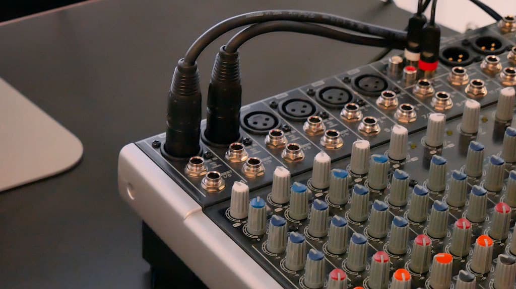 Microphones are connected to long XLR cables which run down under the desk and into the Behringer Zenyx 1222 USB mixer. The mics go into channels 1 and 2.