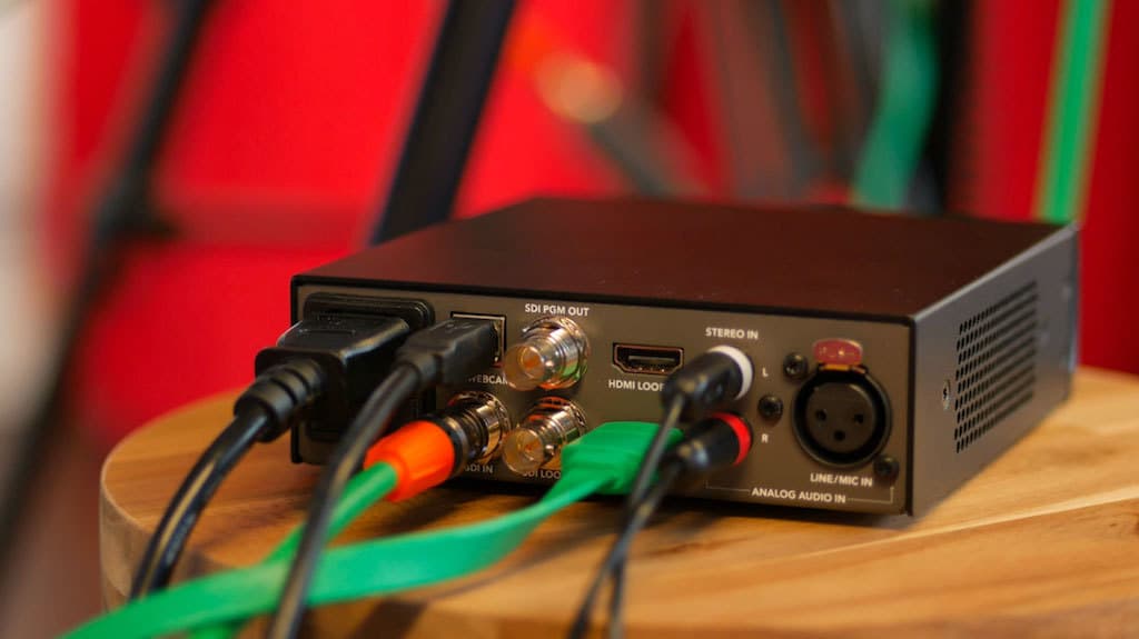 This handles the video input for both cameras and the input from the mixer. The Blackmagic box allows us to manage two cameras at once. This setup works well for us because we're going to be using two cameras and syncing up the audio from the mixer to the cameras.