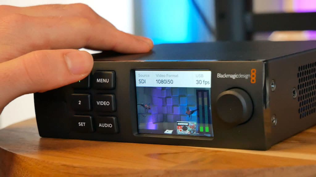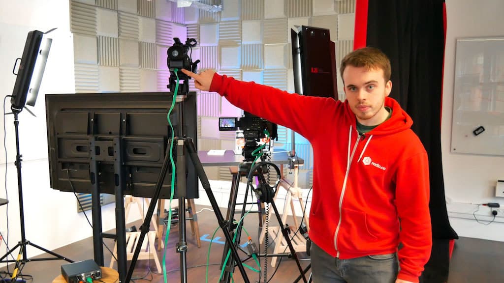 The Blackmagic box lets us switch between either camera, which means we can switch views on the fly for the one we like best. For example, the main camera is used primarily throughout the live event, whilst the secondary camera is for more zoomed in shots for close ups like showing off equipment on the desk.