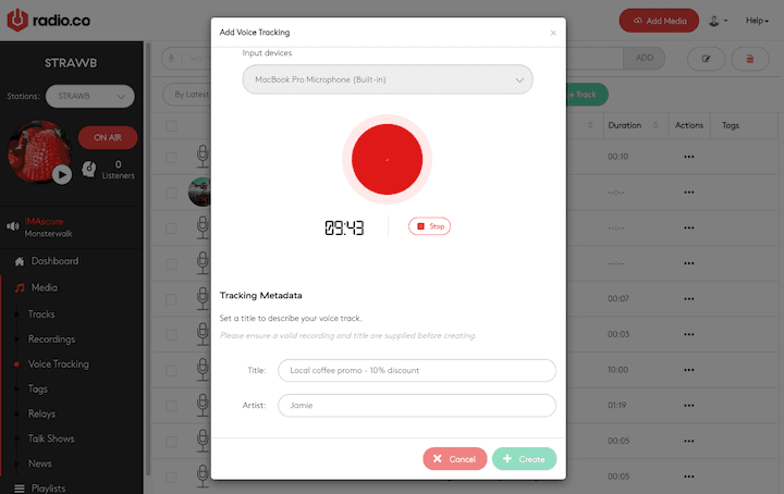 Record audio snippets to sandwich between automated shows. Voice tracking lets you record and add on the fly, like covering breaking news, ad hoc promos, or quick announcements.