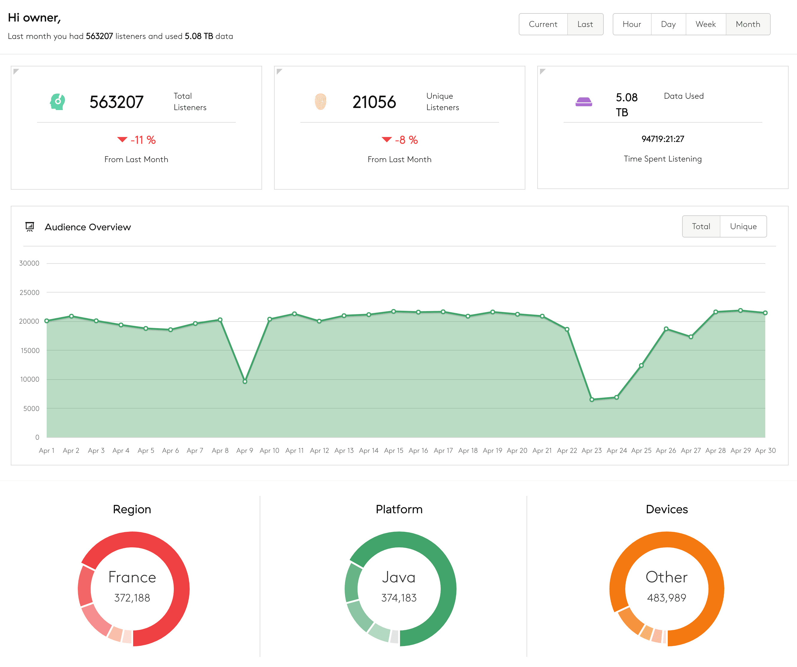 - In the first graph, track unique and total listeners. Hover over each point on the graph or see the average total and unique listeners or the average listening time. Filter the graph using the orange and green buttons above.