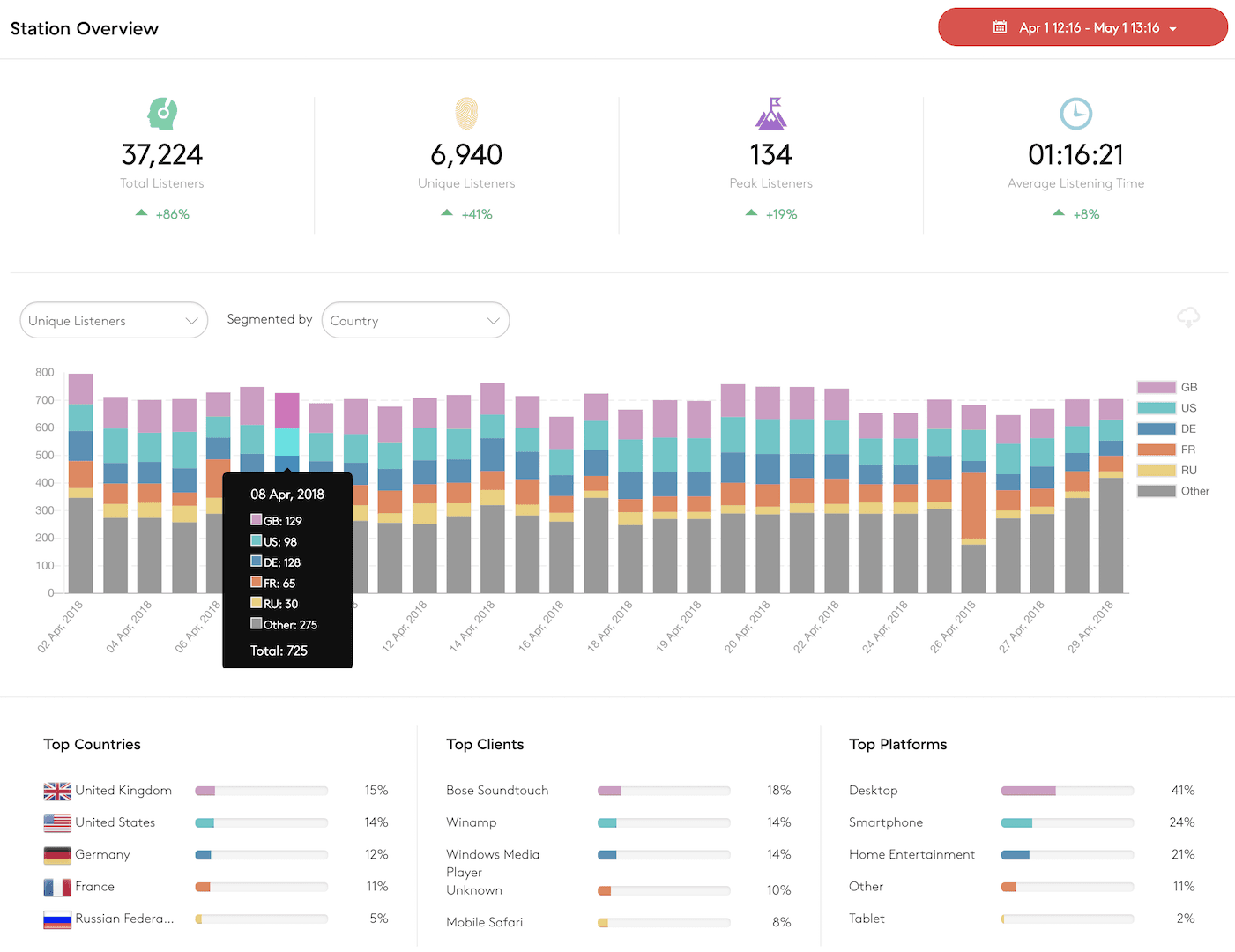 - Segment total and unique listeners by country, platform (type of device), and client (device used).