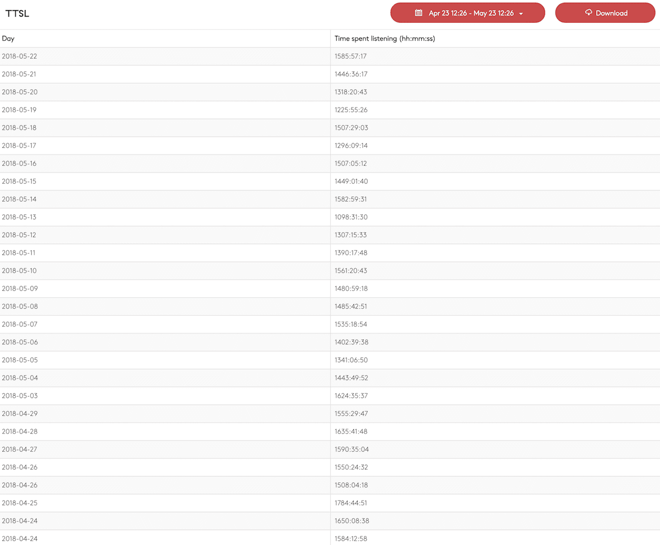 - See a list of total listenership per day for the selected time period in hours, minute, and seconds.