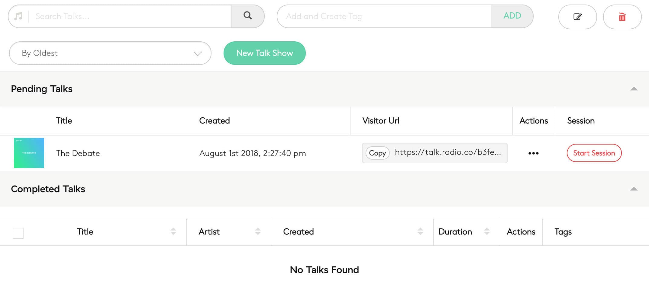 Once you're happy with your recorded radio show, click the Save button. Your recording may take a few minutes to process. Once complete it will appear under Completed Talks in your dashboard:
