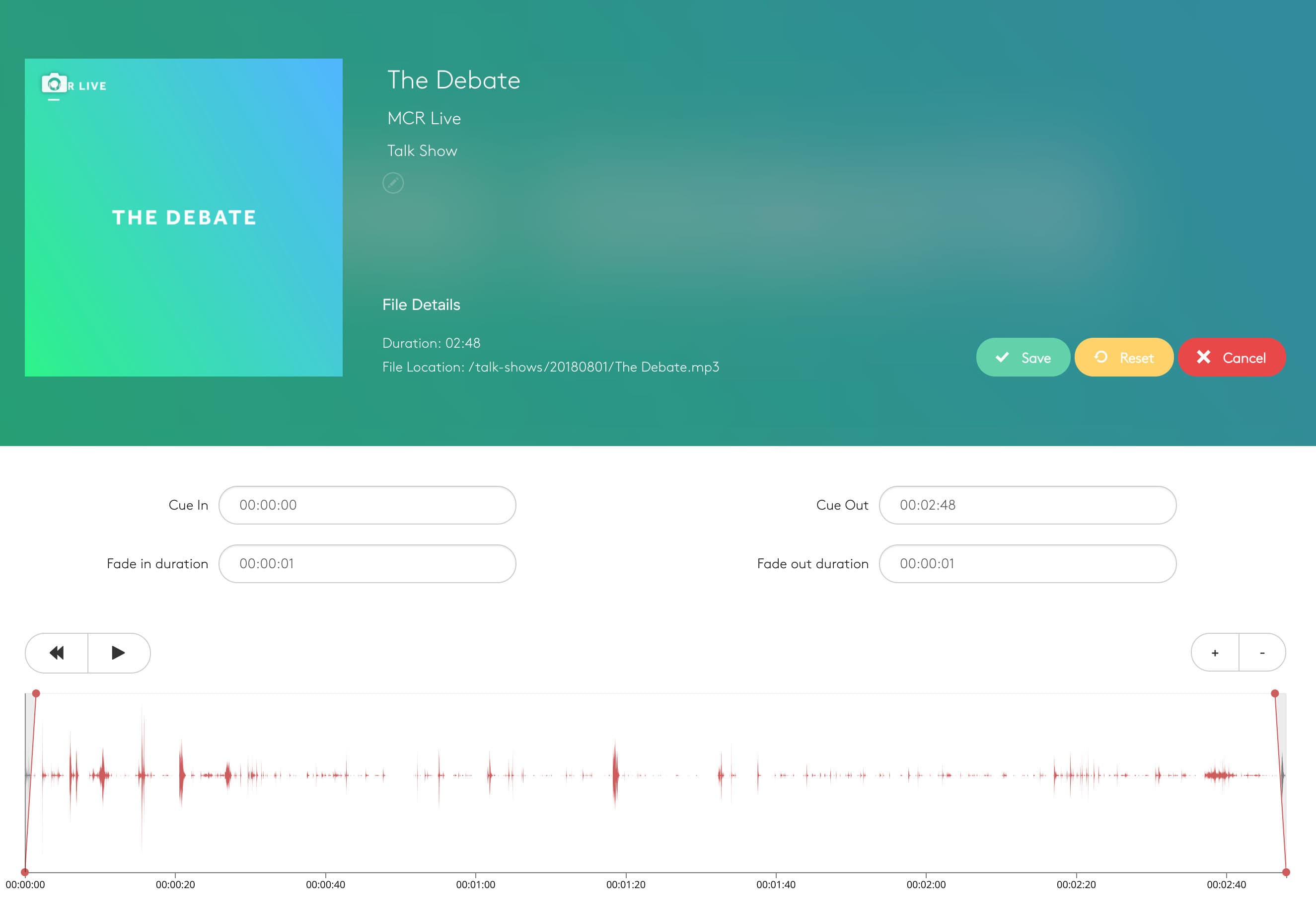 Use the Talk Editor to adjust the title, artist, artwork, and cue and fade points of the track:
