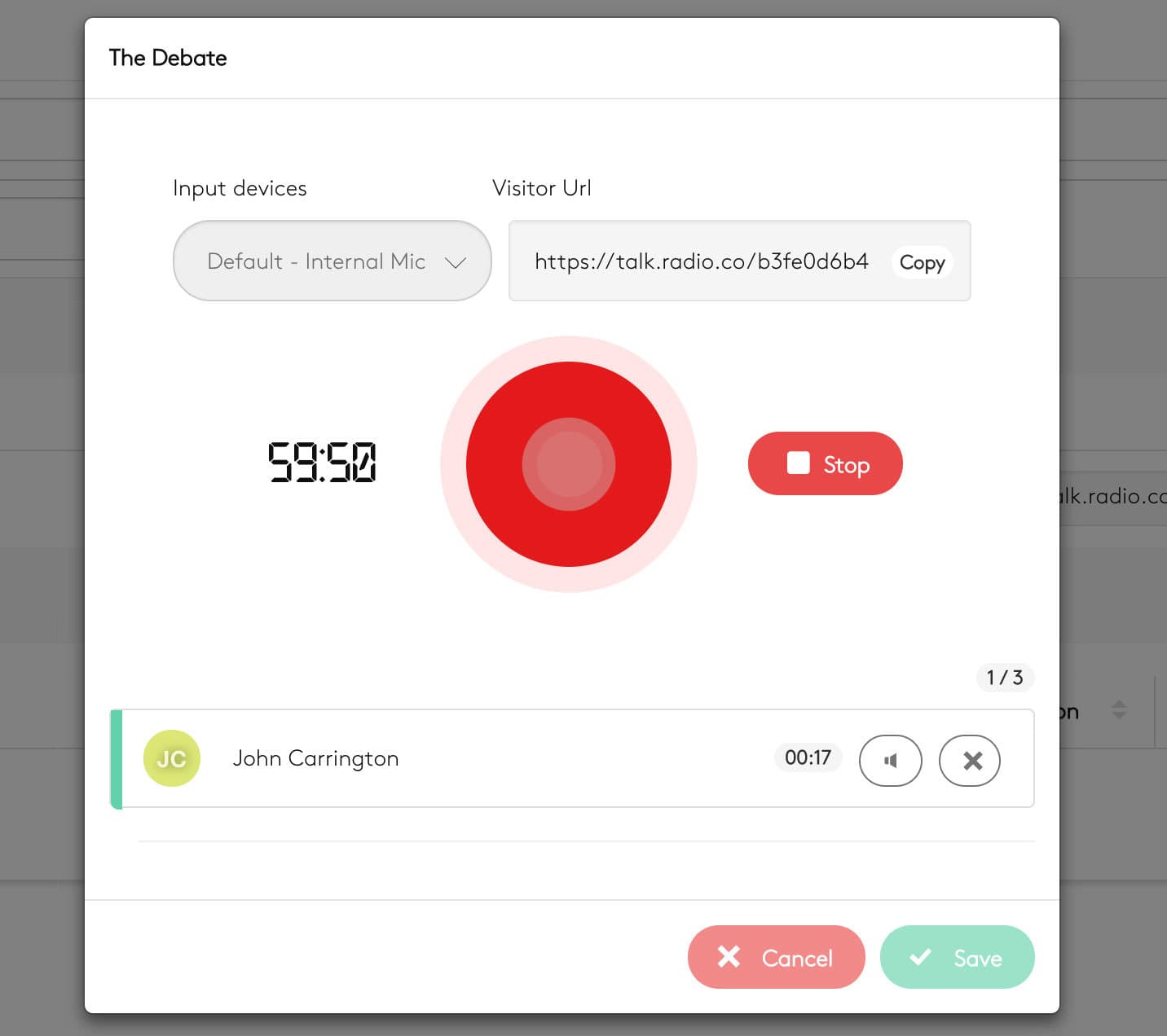 Once all your guests are connected you can begin recording. Click the Record button. Your show can be a maximum of 1 hour long. This is displayed on the countdown timer.