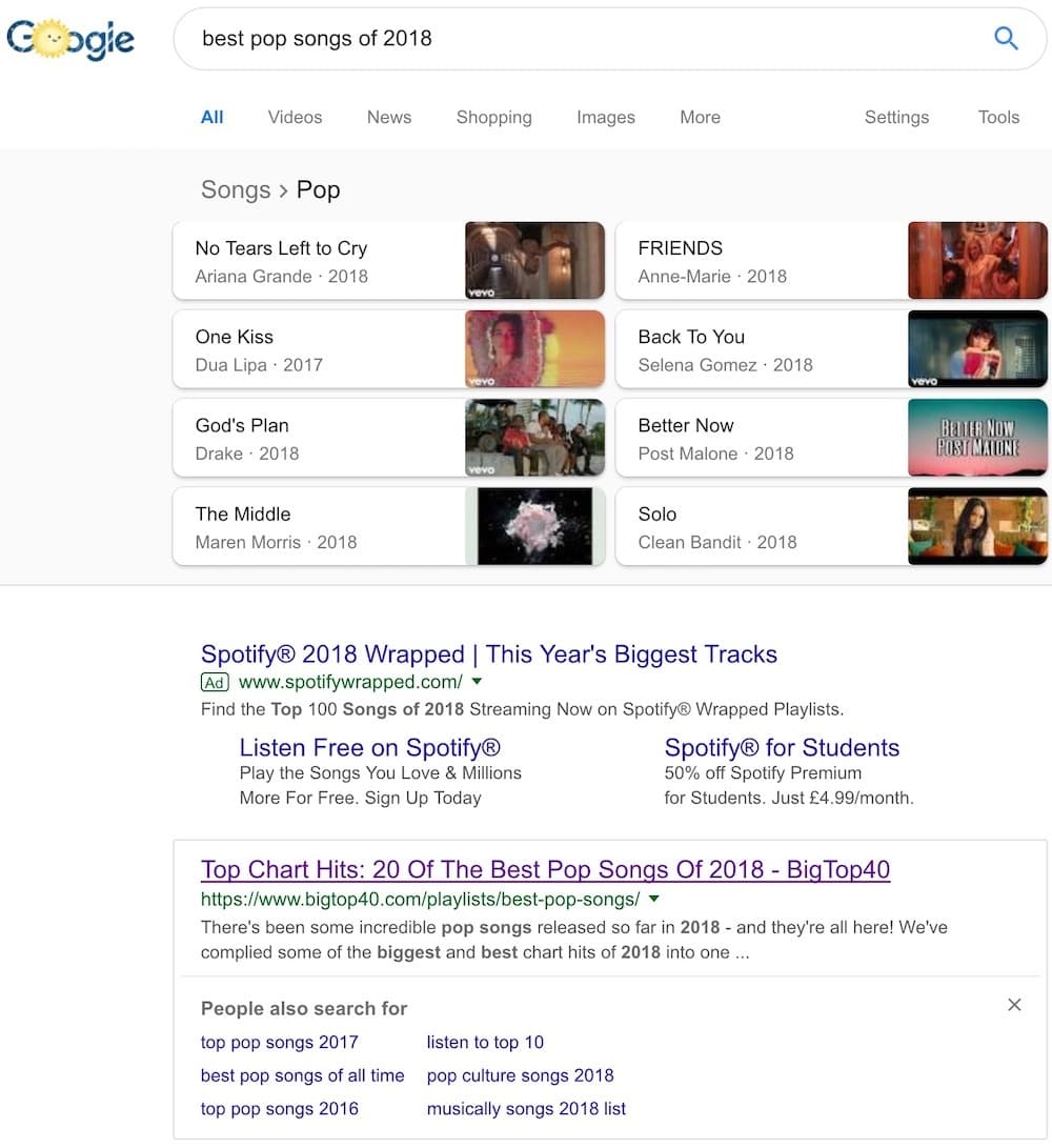 With that in mind, think about the kinds of questions that your listeners are asking. Create blog posts that answer those questions. For example, UK based station Big Top 40, regularly release articles around content discussed during their shows, like what the best pop songs of that year were. When searching for "best pop songs of 2018", they're one of the top search results!