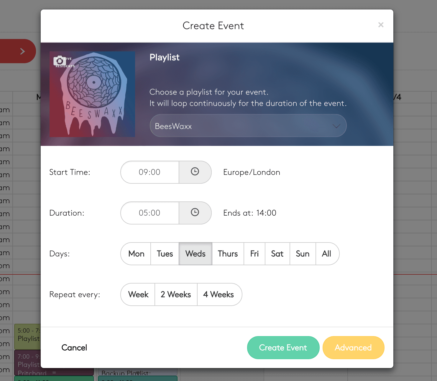Playlist: Choose a playlist from your station. The playlist will loop continuously throughout the duration of the scheduled event.