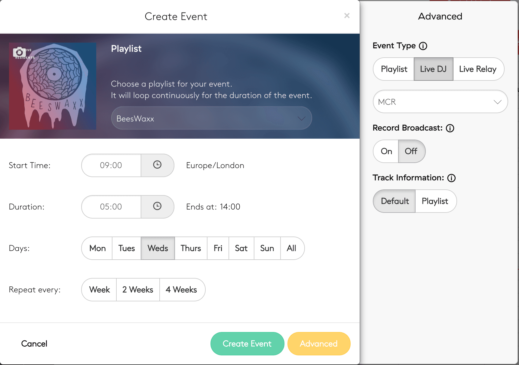 If you wish to schedule a Live DJ or Relay, or change event behaviours, click the yellow Advanced button towards the lower right of the popup. The Advanced drawer will open.