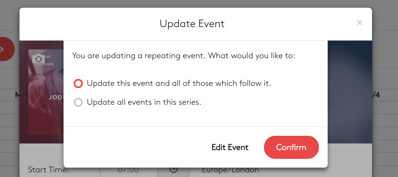 Click the event you wish to update within your calendar. The Event Options popup will appear. You can change all the above options here.